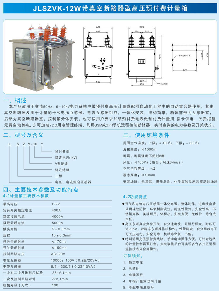 JLSZK-12W2帶真空斷路器型高壓預(yù)付費計量箱