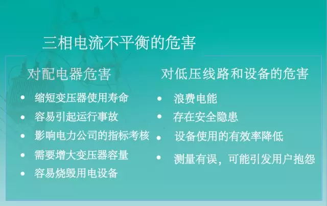 在400V低壓配電系統中,存在很多單相負載,由于各相負載分布不均、單相負載用電的不同時性、以及單相大功率負載接入等原因,容易造成三相電流不平衡,這種現象在全國普遍存在。
